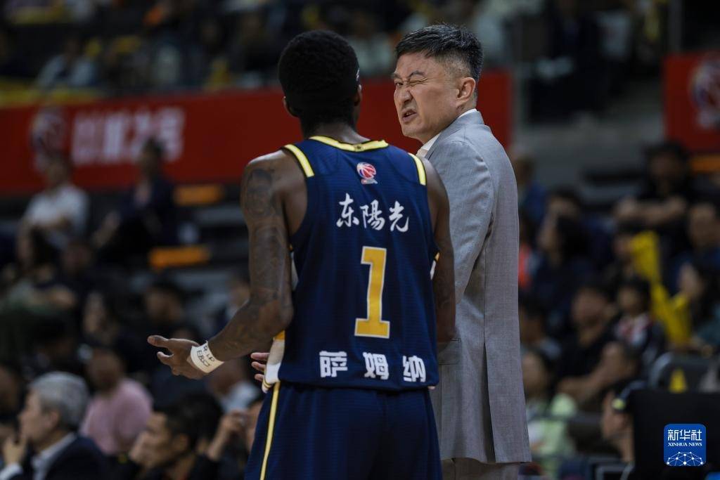3月17日,广东东阳光队主教练杜锋(右)在比赛中与球员萨姆纳沟通。