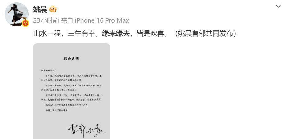 01姚晨和曹郁的离婚声明发布得挺得体的。“这段山水,真是三生三世的幸运。缘分来了又走,都是美好的回忆。”他们说,离婚后还是朋友,仍会一起照顾孩子,工作上的合作也会继续进行。