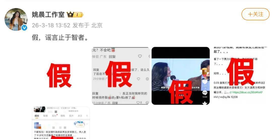 姚晨的工作室也没闲着,在3月18日午饭时间发布了辟谣声明。他们直接放出了五张带有“假”字样的截图。这些截图分别跟“姚晨和侯雯元在一起”“姚晨催促侯雯元跟钟楚曦分手”等具体的谣言有关。“假的,谣言止于智者!”这态度真是一针见血,毫不含糊,完全没给人留丝毫的疑问。