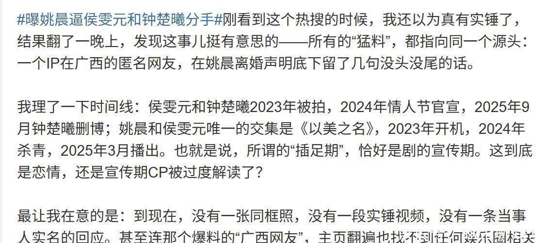 还有另一位网友说,姚晨为了能和侯雯元待一块,逼着他和钟楚曦分手。
