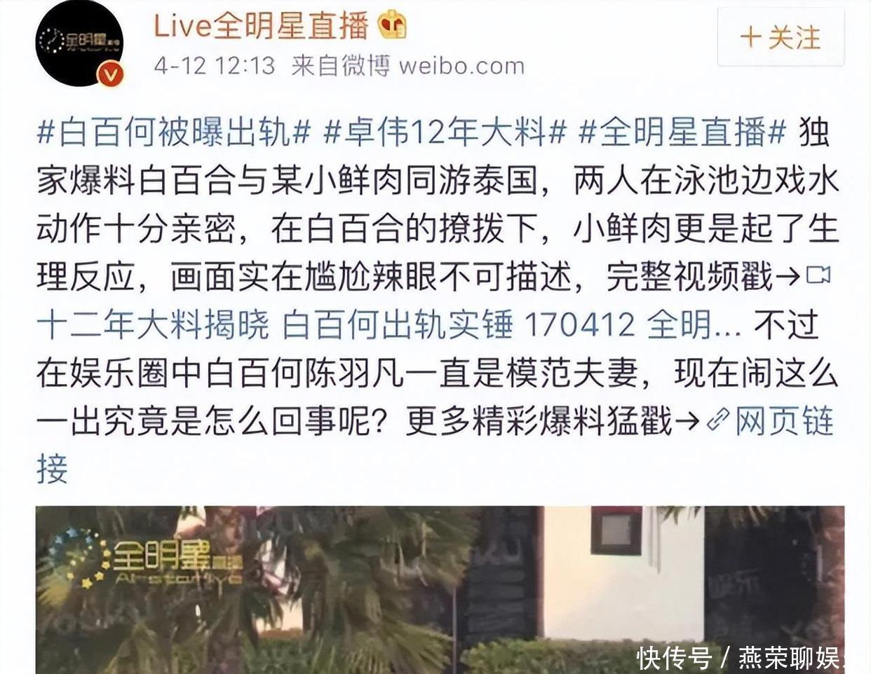 原来,被称为娱乐圈第一狗仔的卓伟,他的团队在泰国拍到了白百何和一名男士在泳池里玩耍的视频。视频里,白百何和那位男士一起畅游,还做了一些亲密的动作,比如说“一指禅”。卓伟团队曝光白百何婚内出轨的消息,引发了网友们的纷纷指责。