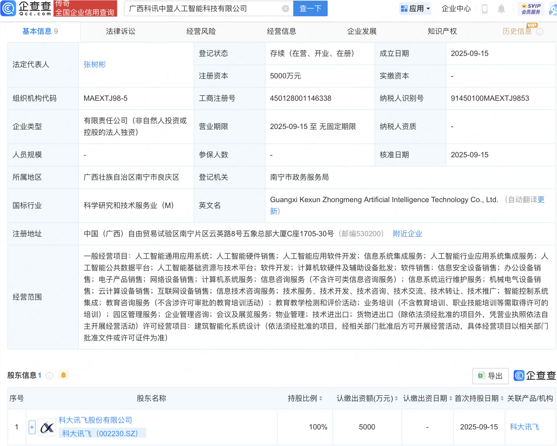 近日场外配资网站,广西科讯中盟人工智能科技有限公司成立,注册资本5000万元,经营范围包含:人工智能通用应用系统;人工智能硬件销售;人工智能应用软件开发;人工智能行业应用系统集成服务等。企查查股权穿透显示,该公司由科大讯飞(002230)全资持股。