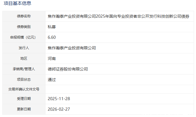【大河财立方消息】2月28日消息,焦作瀚泰产业投资有限公司2025年面向专业投资者非公开发行科技创新公司债券项目获深交所通过。