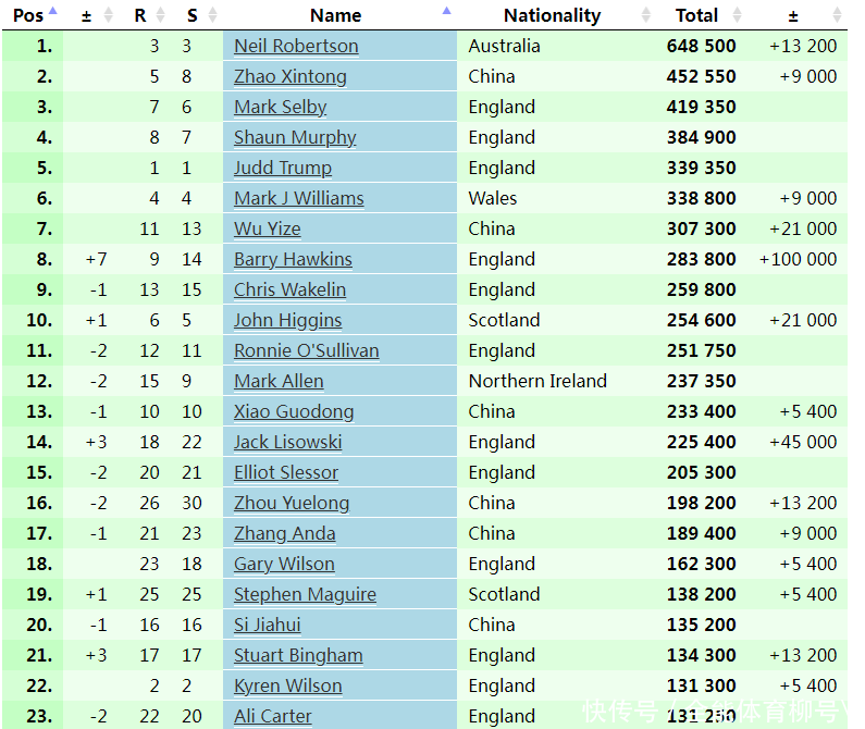 北京时间3月4日消息,随着巴里-霍金斯以9-5战胜杰克-利索夫斯基,夺得2026年斯诺克威尔士公开赛冠军,单赛季最新世界排名榜单变化如下,夺得冠军的霍金斯上升到第8,新科世锦赛冠军赵心童依旧高居第2,罗伯逊第1、吴宜泽第7、奥沙利文第11。